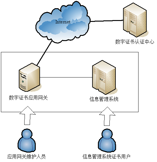 数字证书应用网关是数字证书认证系统的一个重要扩展应用。系统部署在信息管理系统前端,与数字证书认证系统相连。数字证书应用网关为信息管理系统提供证书申请、证书查询、加密服务、证书验证服务等。数字证书应用网关与信息管理系统、数字证书认证系统的关系示意图如下图所示: